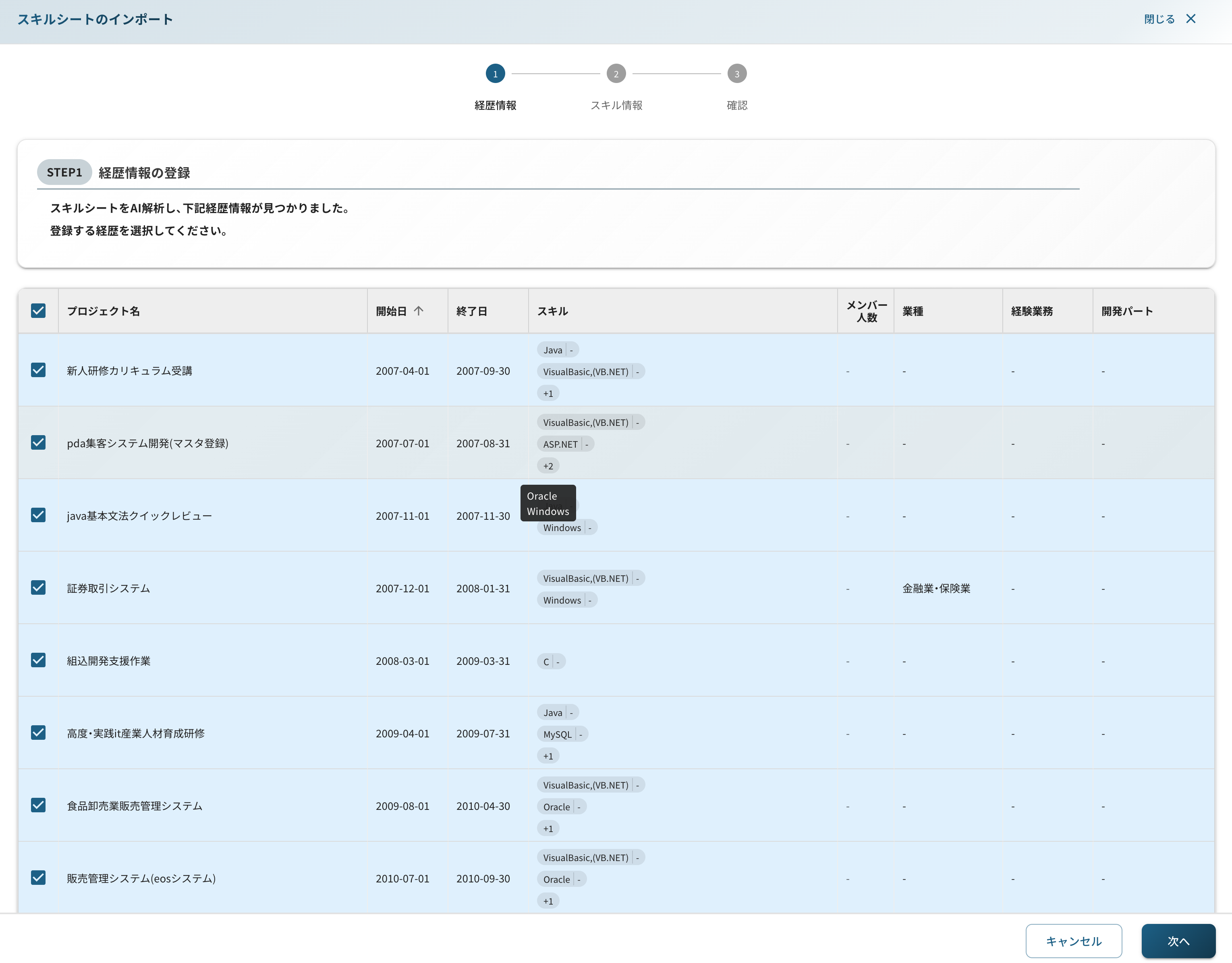 • AIが抽出したプロジェクト経歴一覧が表示されます