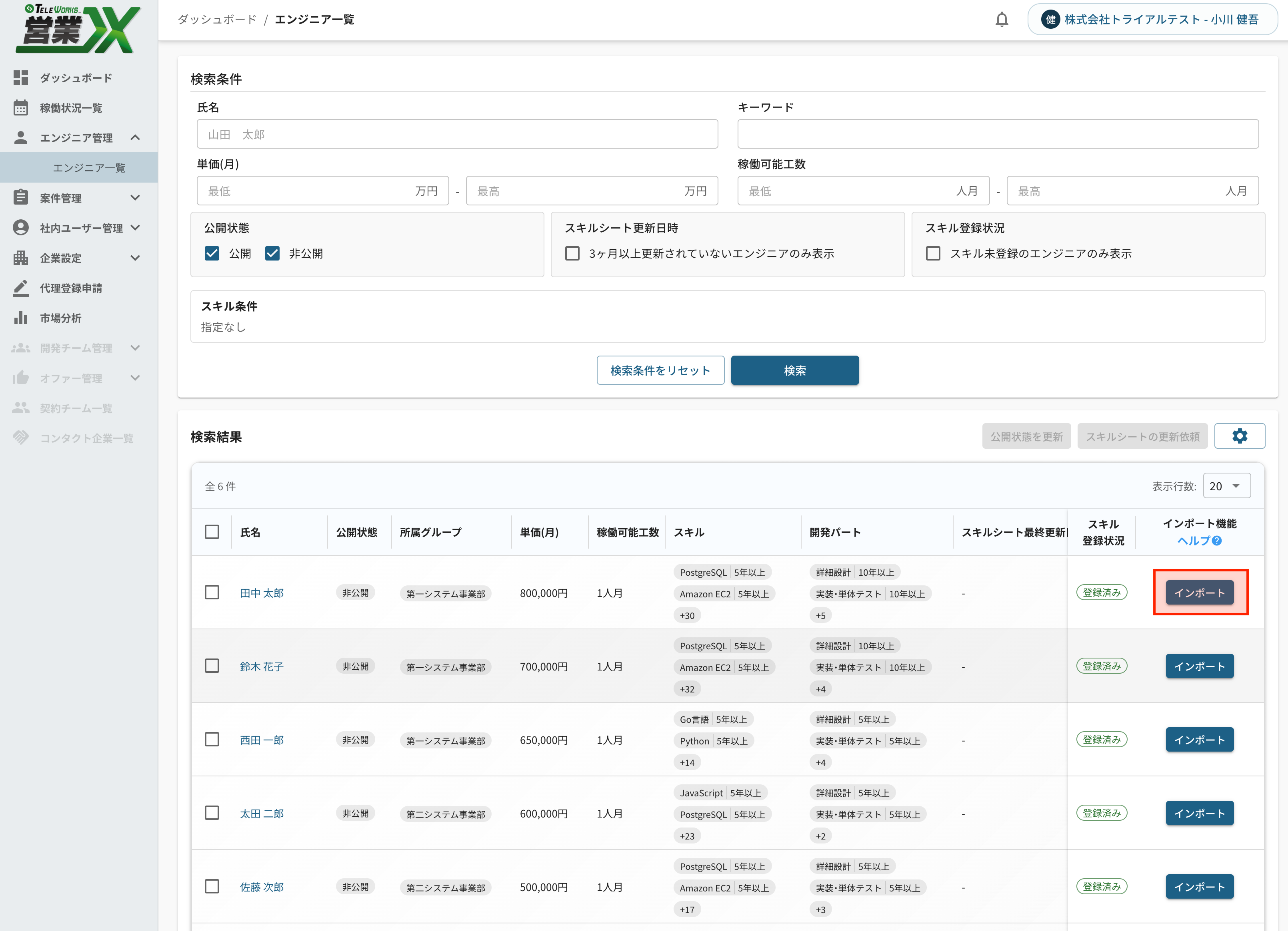 2. 対象エンジニアの [インポート] ボタンをクリックします