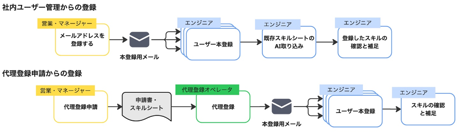 社内ユーザー管理のユーザー登録から行う方法と、ユーザー登録と既存スキルシートの移行を代理登録で依頼する方法です。