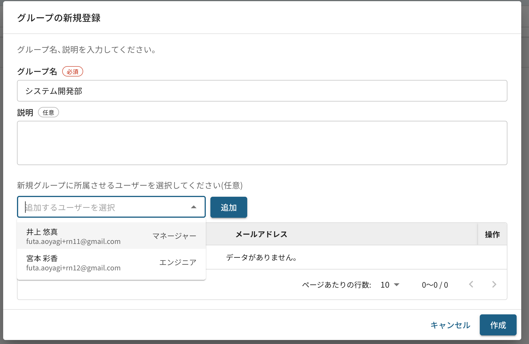 を選択して、グループ名と所属させるユーザーを選択して