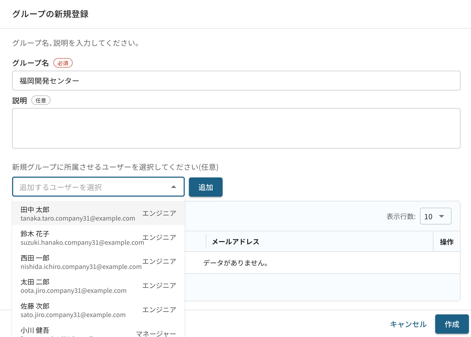 グループ名を入力し、所属させるユーザーを選択して [作成] します