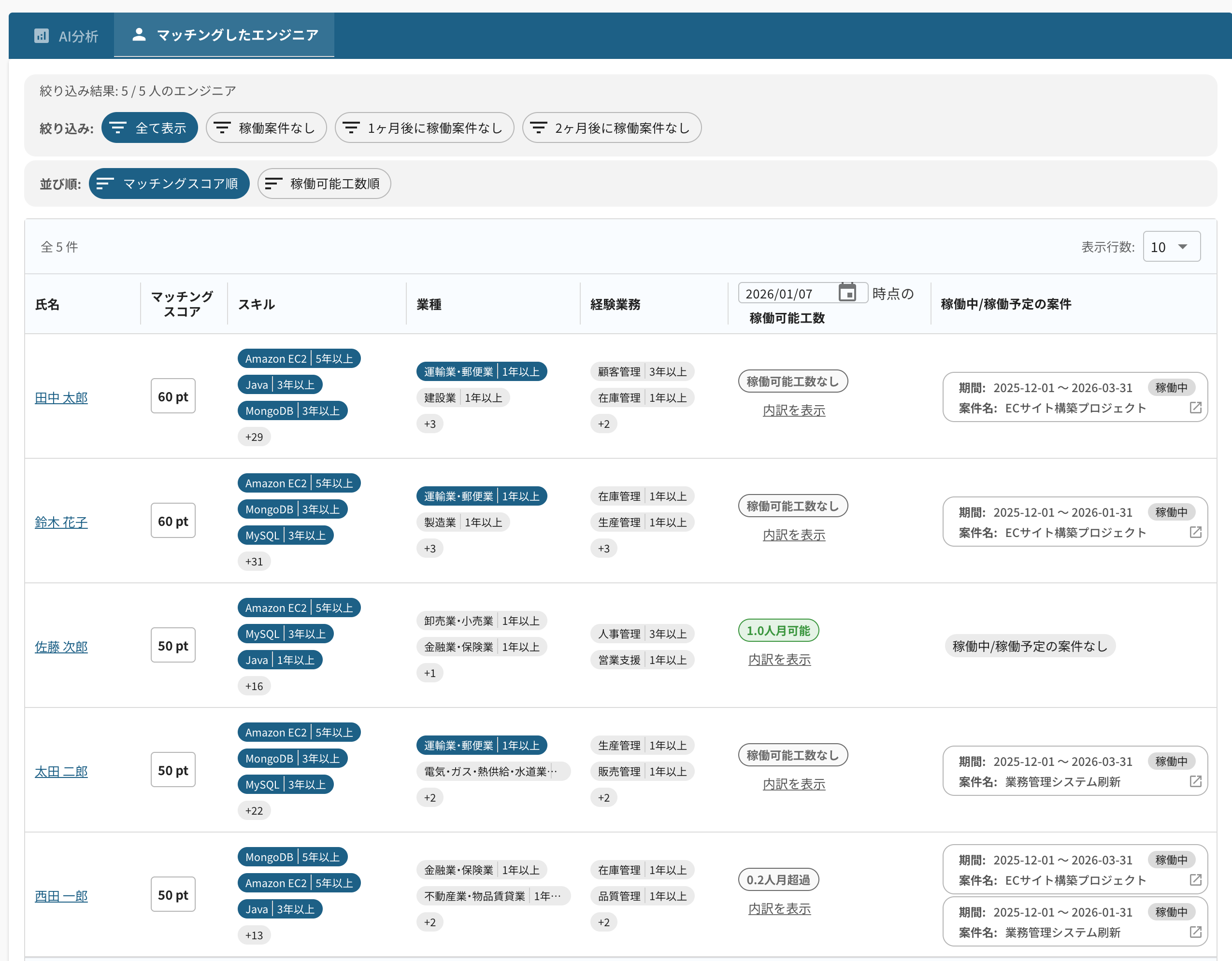 [マッチングしたエンジニア]は、AI分析で抽出された要求スキルに合致するエンジニアを一覧で確認できます。