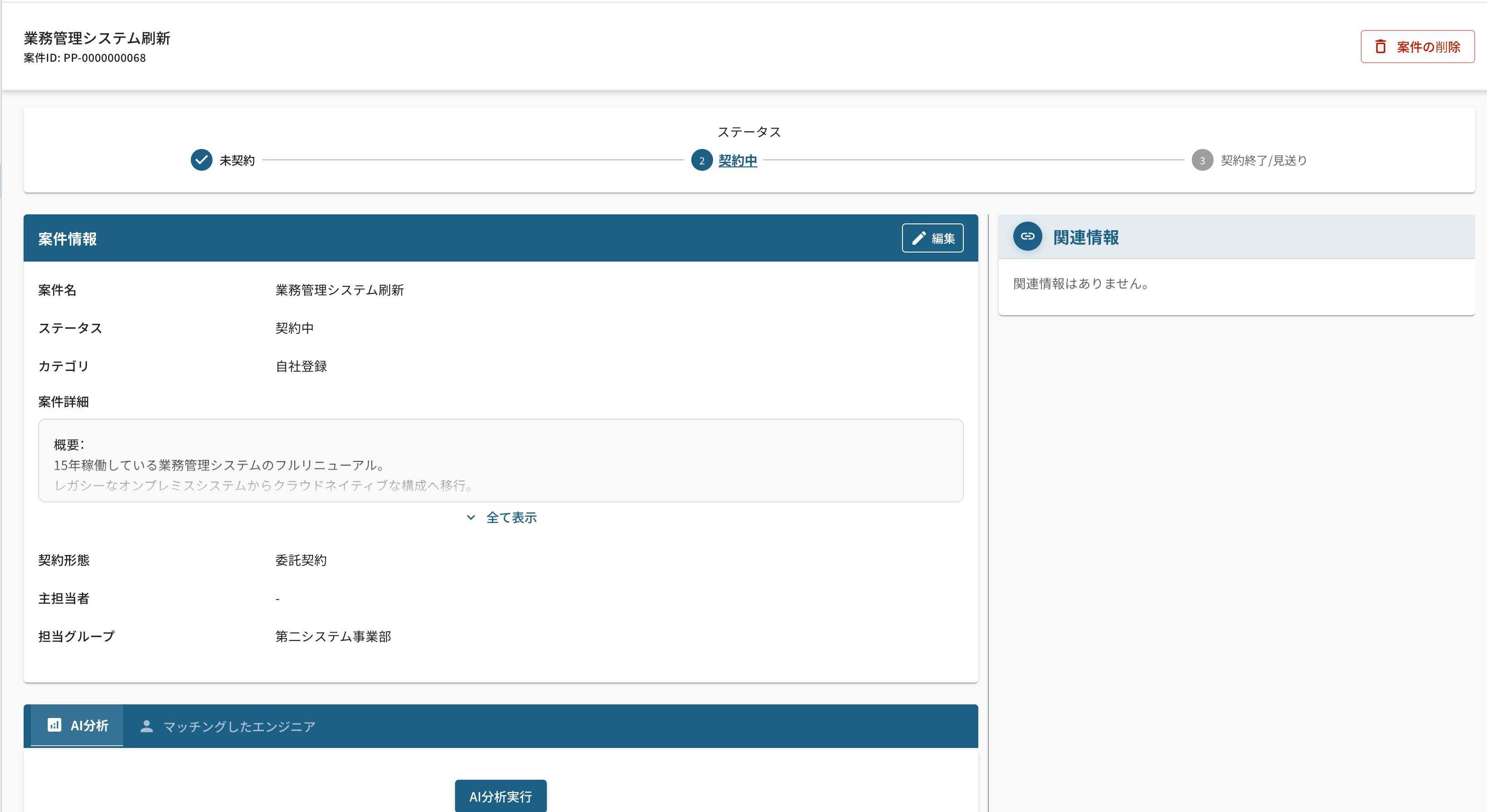 この画面では、案件内容の確認に加えて、AI分析やエンジニアマッチングを行うことができます。