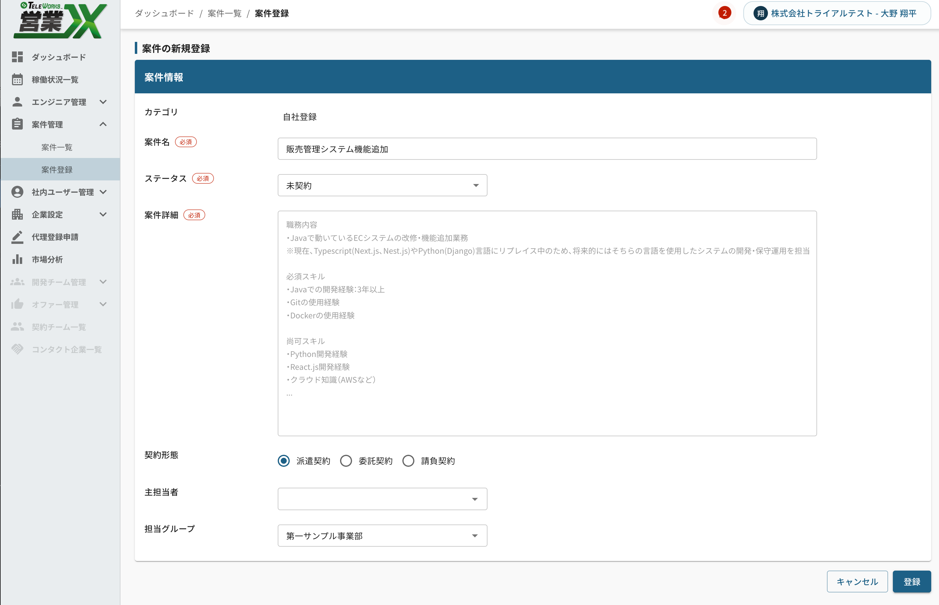 案件管理では、自社が扱う案件情報を一元管理し、エンジニアとのマッチングや稼働状況の確認を行うことができます。 案件情報を起点に、営業活動・要員アサイン・契約管理までを効率化するための画面です。 案件の種類 本サービスでは、案件を以下の3種類に分類して管理します。 自社登録 自社で獲得した引き合いや、営業活動によって発生した案件です。 オファー 発注側企業からのオファーに紐づいた案件です。 Teleworks Teleworksに掲載されている案件です。 ...